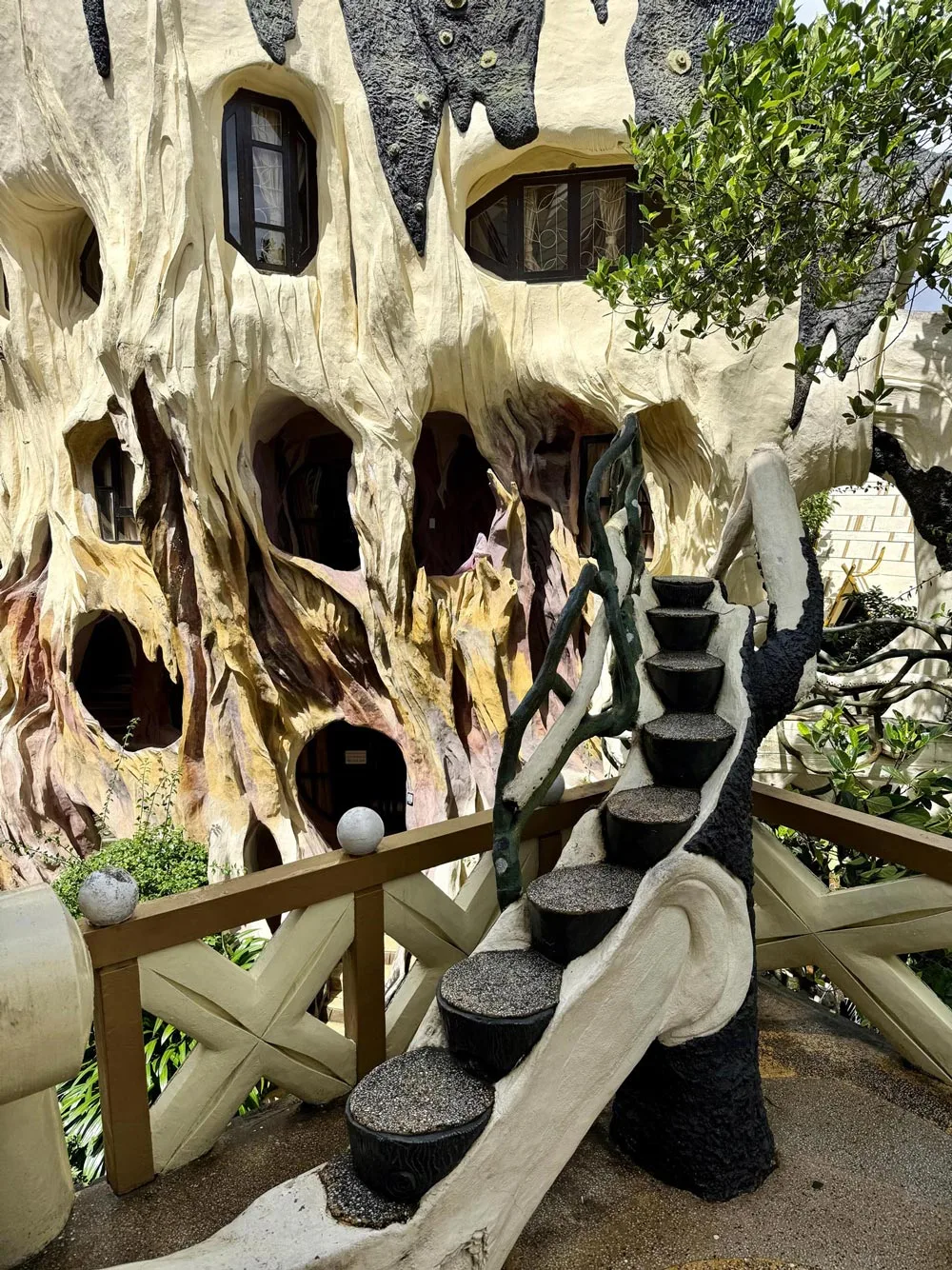 The main structure resembles a massive tree with cement “branches” connecting different areas throughout the property. The building’s exterior resembles a five-story-high banyan tree, with unevenly shaped window openings and branch-like structures that appear to grow along its walls and rise above the roof into the sky.