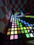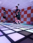 The entire floor is covered in light-up colored tiles. When a color lights up, you run, step, or jump to hit it before it vanishes or follow particular patterns, or touch your neighbors’ squares to take over their territory (Depending on the game you choose). Some game modes encourage cooperation (everyone works together to reach room targets), while others pit players against each other in thrilling challenges. Our boys loved trying to beat each other’s scores while we attempted to keep up.