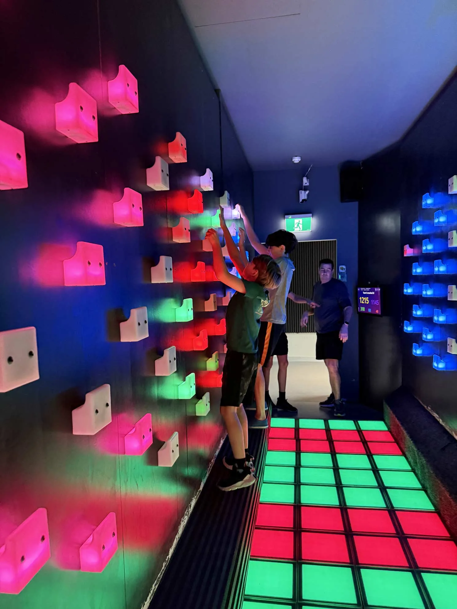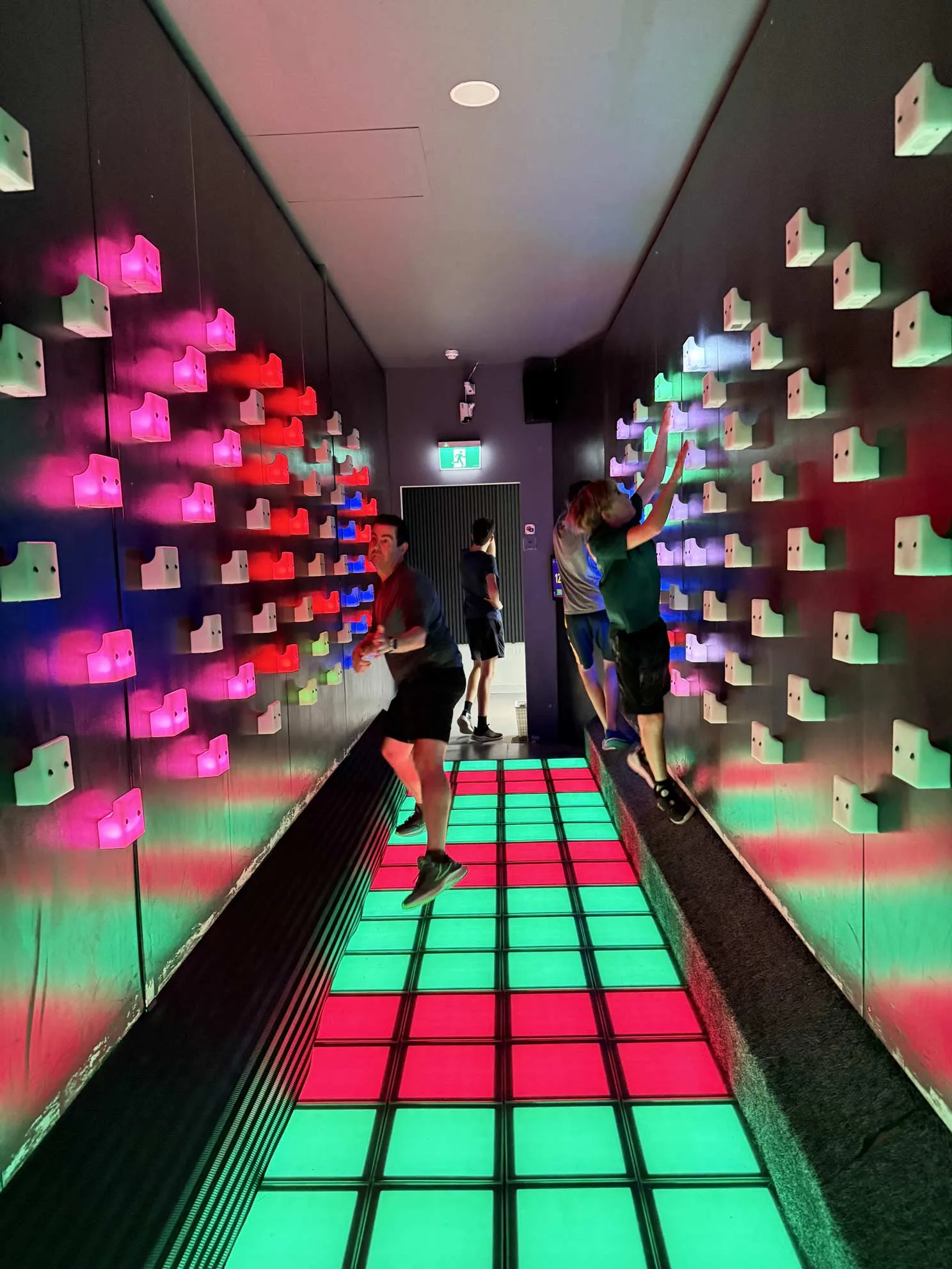 • In the climbing wall room, our 11-year-old almost grabbed a red handle right before time ran out—the look of relief when he pulled back in time was priceless.