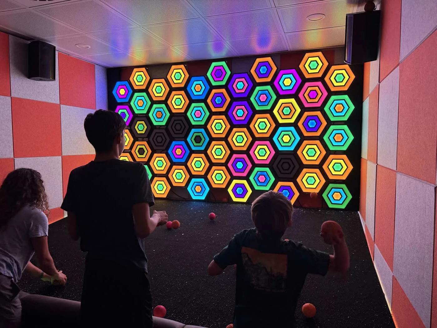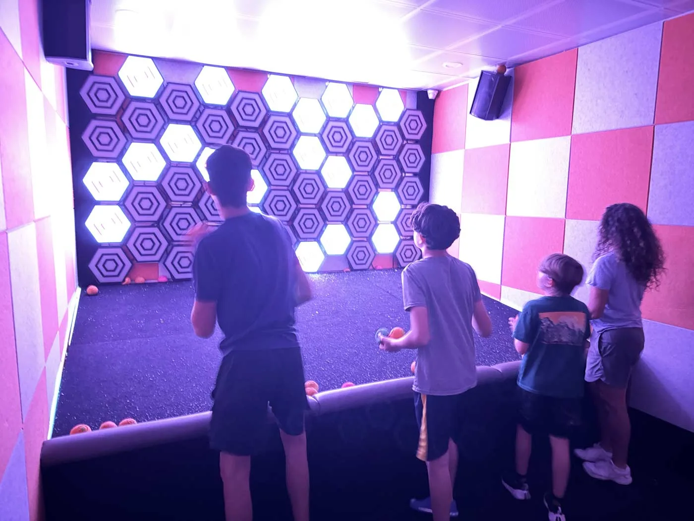 Multiple basketball hoops line the walls, each with light-up backboards. The lights indicate where to shoot, and you grab balls and fire them at the lit targets as fast as you can. Our 16 and 14-year-olds turned this into epic battles, competing head-to-head, while our 11-year-old preferred the cooperative modes where the whole family worked together towards gaining points for our family on the leaderboard.
