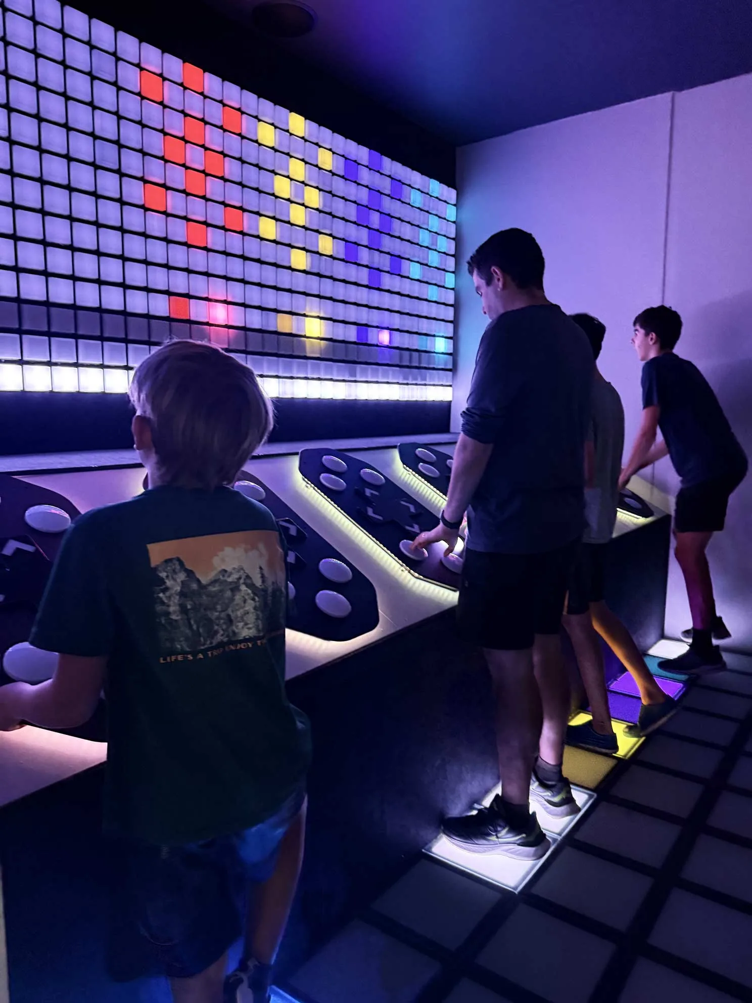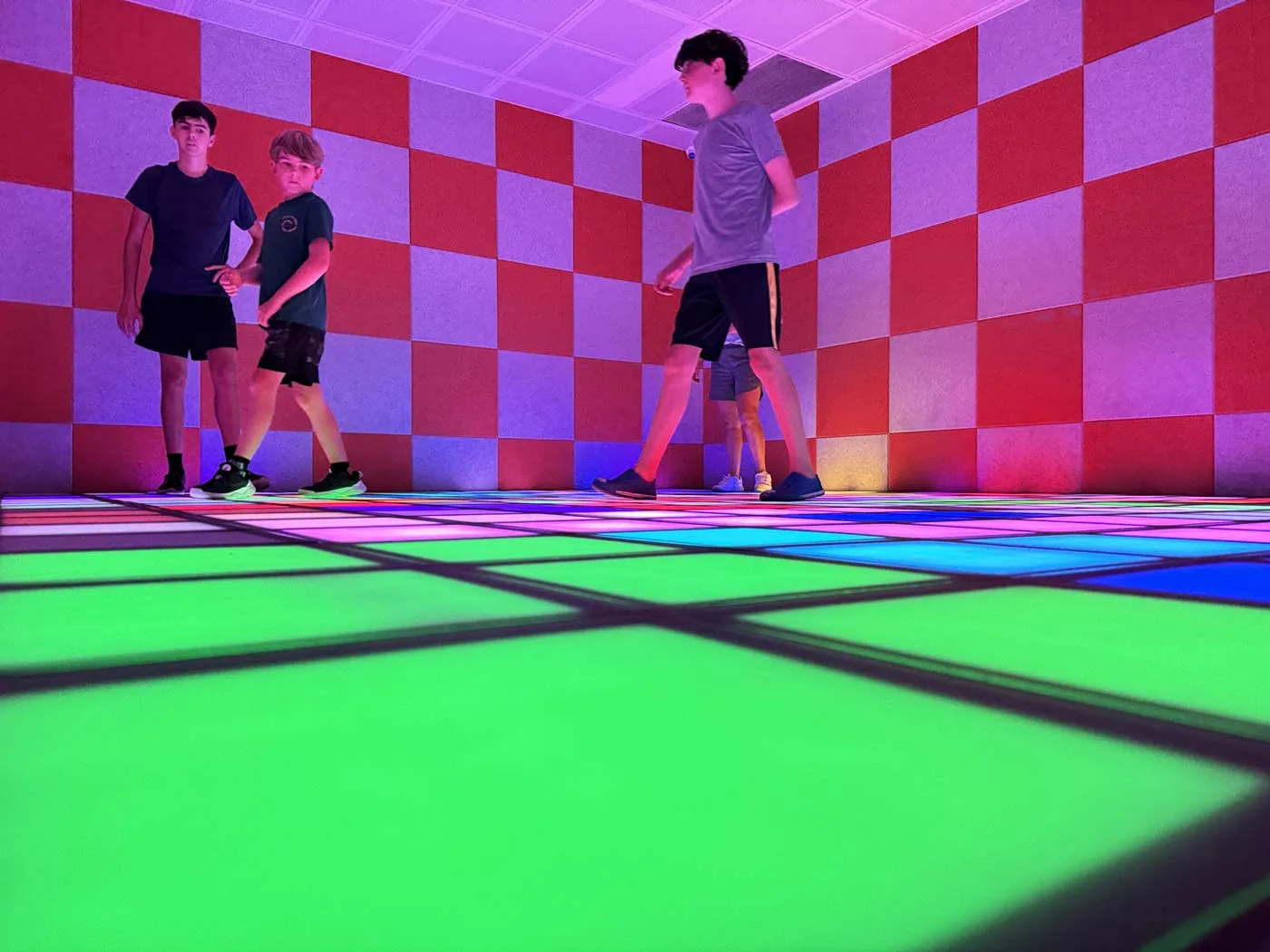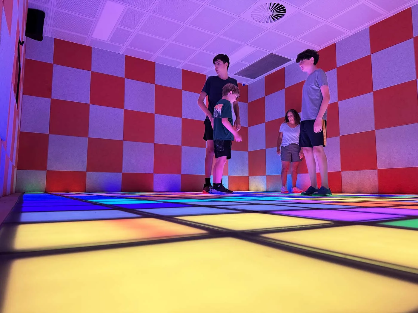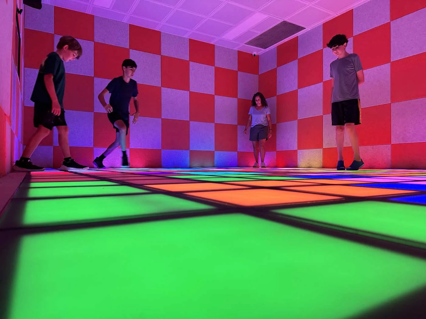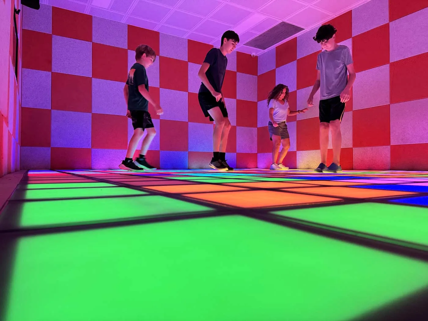 The entire floor is covered in light-up colored tiles. When a color lights up, you run, step, or jump to hit it before it vanishes or follow particular patterns, or touch your neighbors’ squares to take over their territory (Depending on the game you choose). Some game modes encourage cooperation (everyone works together to reach room targets), while others pit players against each other in thrilling challenges. Our boys loved trying to beat each other’s scores while we attempted to keep up.