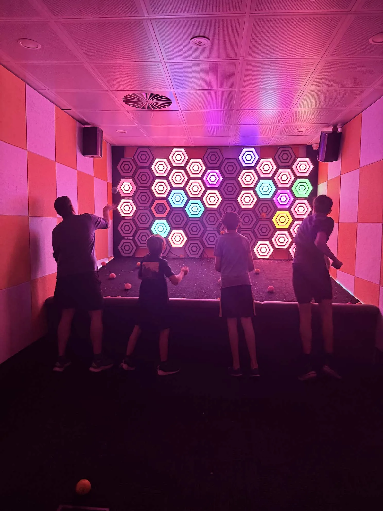 The fifth room offers another variation of light-up targets focused on reaction time and hand-eye coordination. Throw balls to hit particular targets at proper times. Easy settings are a single-color target, while harder settings are targets of a certain color configuration with an outer ring, inner ring, and bullseye.