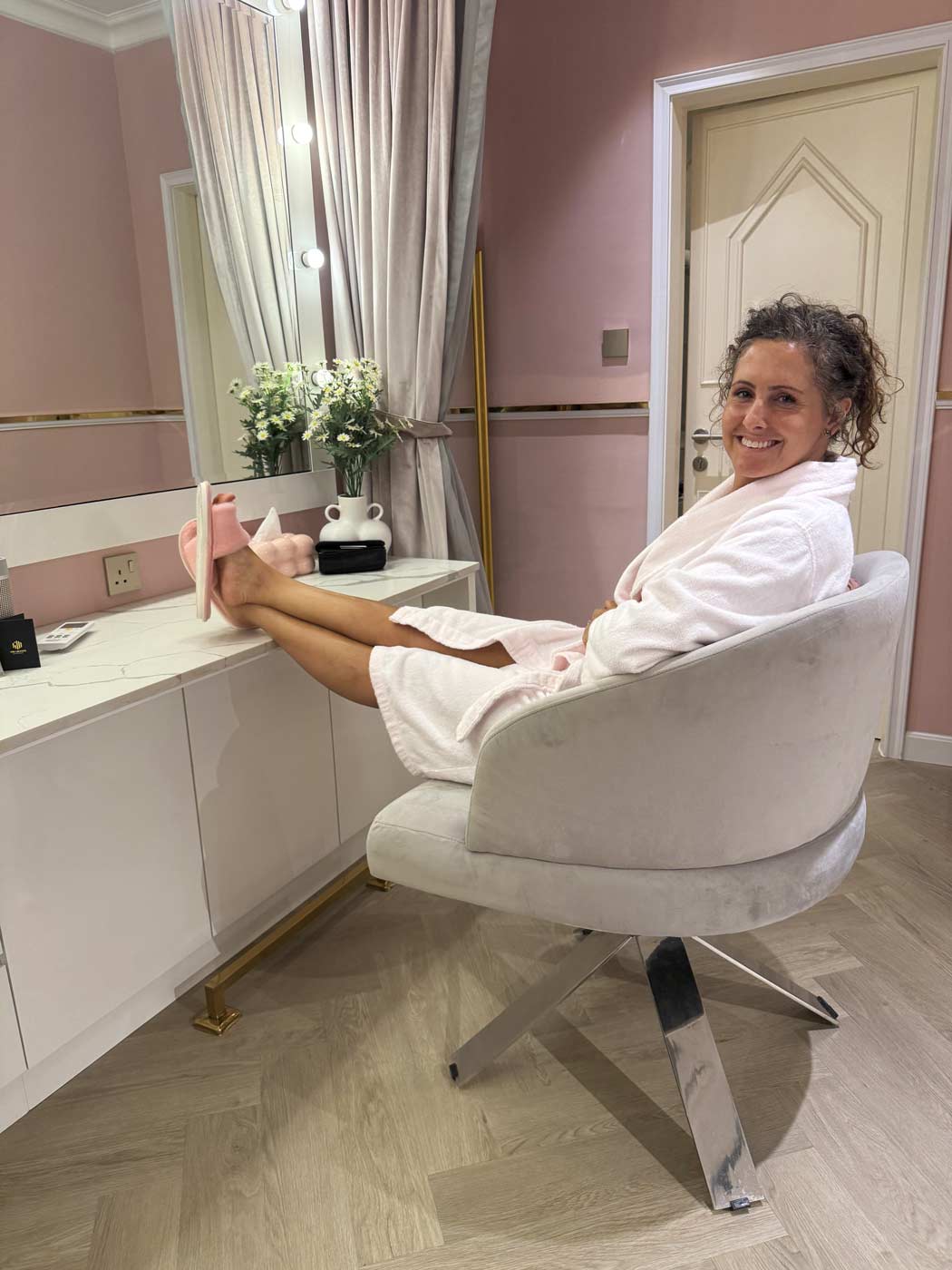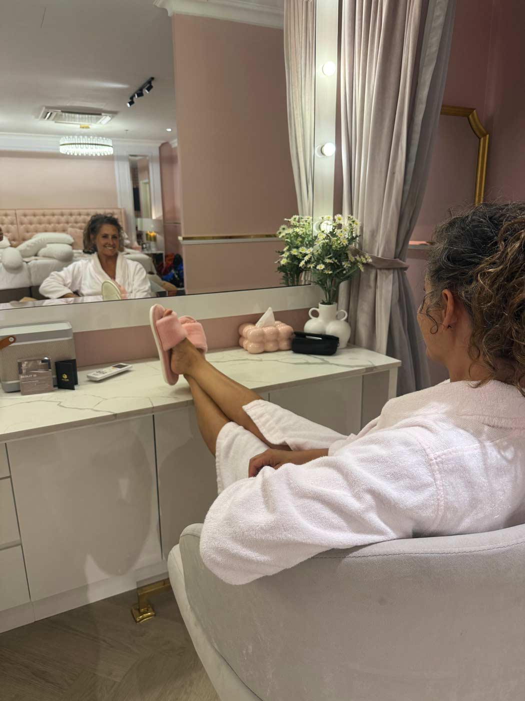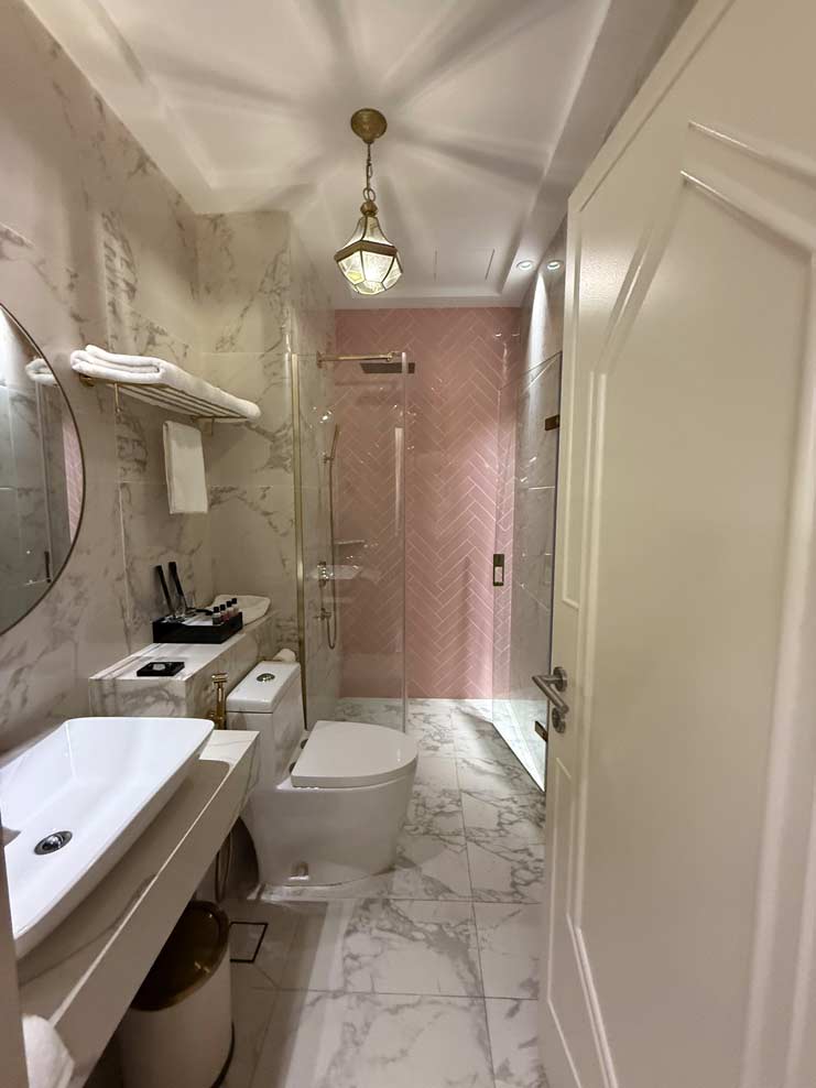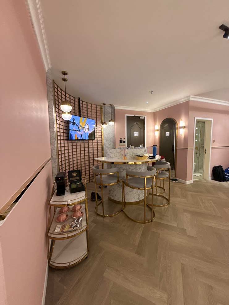 The moment you walk into the Diva Suite, it’s clear that subtlety was not the goal. The room leans fully into its theme with bold, glamorous design and pink everywhere. From the décor to the lighting and furnishings, the space feels intentionally dramatic — the kind of place designed for celebrating or getting ready for a big night out.