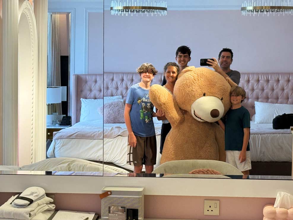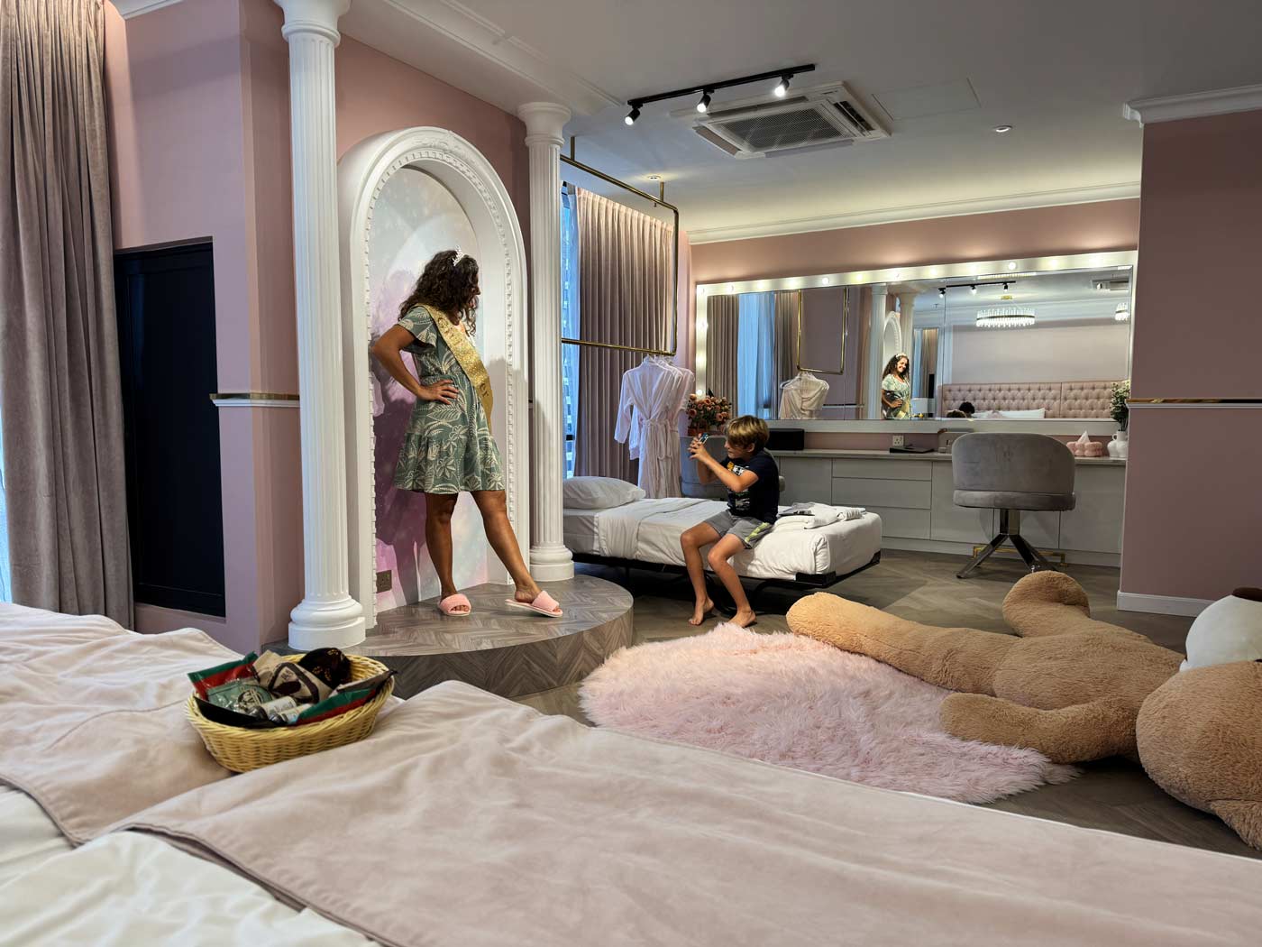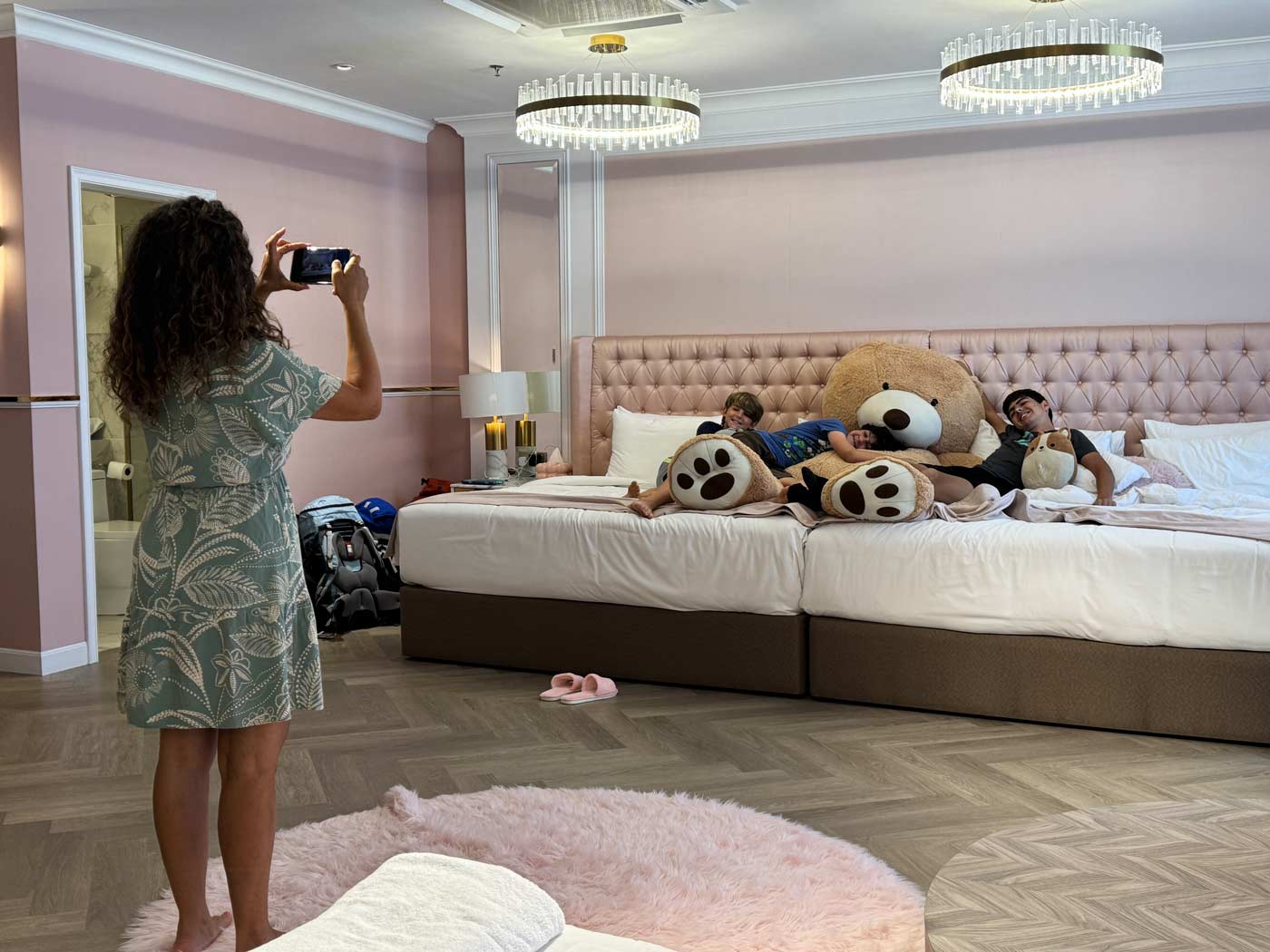 For travelers looking for a memorable or photo-friendly room, the design definitely delivers. It’s the sort of suite that feels made for birthday celebrations, girls’ trips, or a bachelorette party, complete with an over-sized teddy bear.