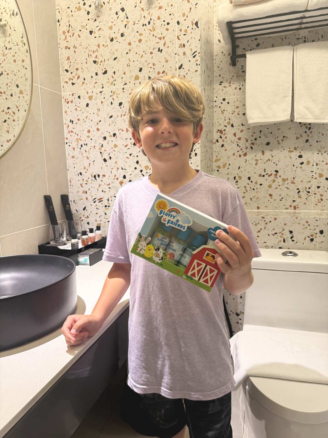 The beds and bedding were also some of the most comfortable we experienced during our travels in Malaysia (which we’re sure is the case throughout the hotel). The hotel offers a pillow menu, which was a fun surprise and a first-time experience for us. Our youngest took full advantage of it and called the front desk to request a full-body pillow and a memory foam pillow to try out during our stay. The suite was exceptionally clean, and the quality of its amenities stood out.
