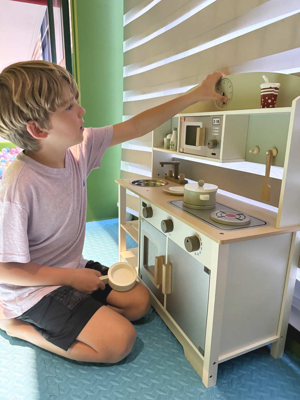Another element our boys loved was the crawl space that wraps around the upper part of the room and is part of a large tunneling system. This area also includes a bakery corner for imaginative play, letting kids pretend and explore. It creates a hidden pathway that kids can explore and adds a playful, adventurous feel to the suite. Even with older kids, this feature turned out to be a highlight.