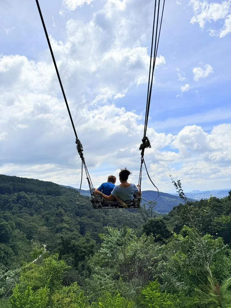 Our visit with our three boys (16, 14, and 11) in November 2025 lasted about 90 minutes, including buying tickets, riding the green line go-kart down, dipping our feet in the stream at the bottom, shuttling back to the top, stopping at the big swing for some photos, then taking the red line go-kart down, and shuttling back to the entrance.