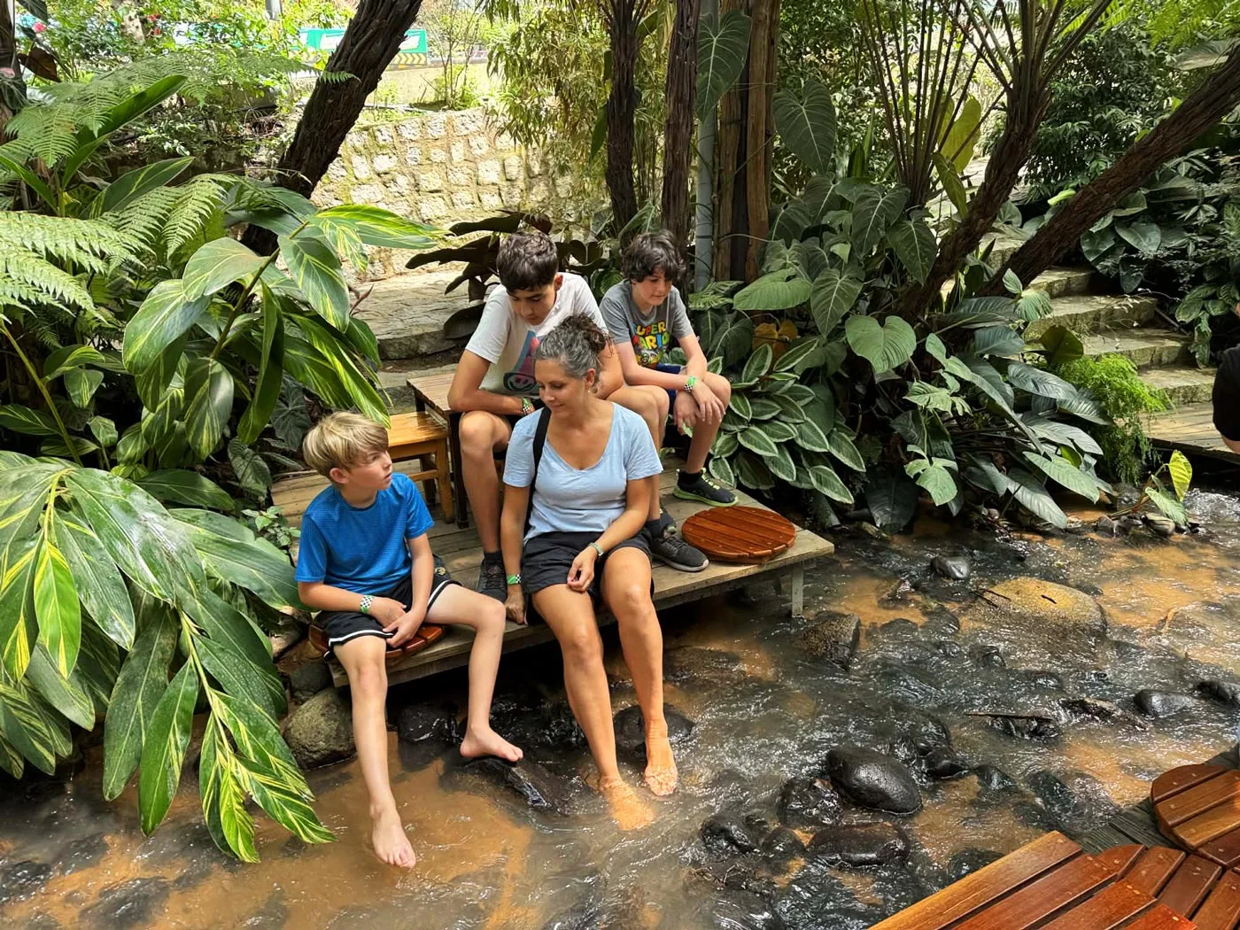 There’s a stream with seats along it for cooling off and hair dryers to dry your feet before getting in the shuttle up the hill