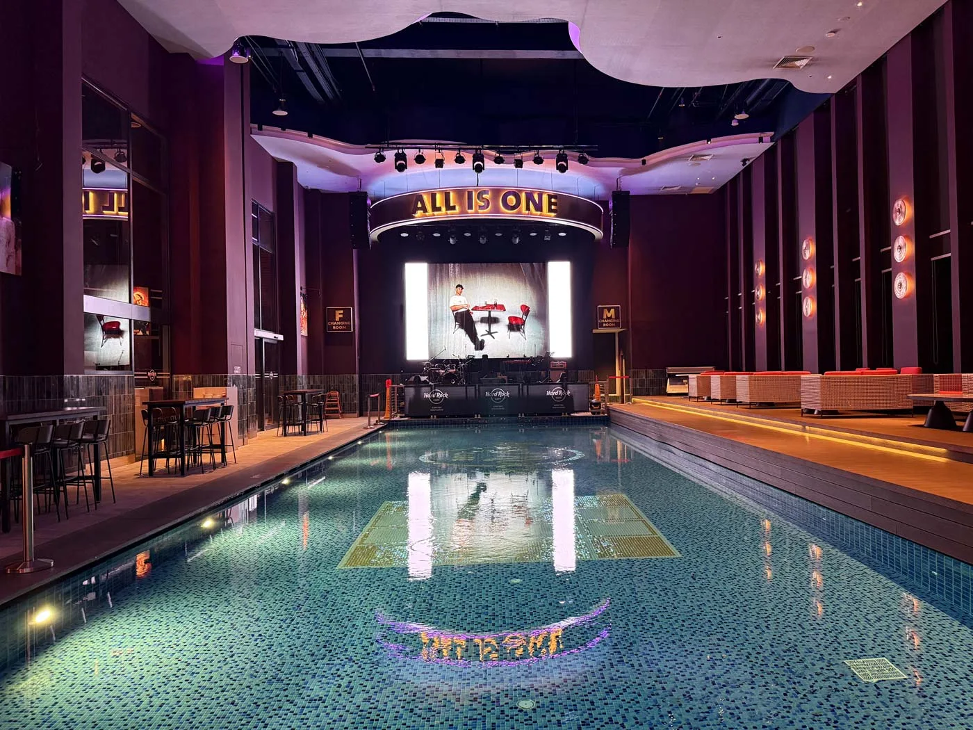 The Hard Rock Cafe on-site sits on the 50th floor with mountain views, making it genuinely unique. Live music plays most evenings on a stage in a room that contains an inground (in floor?) pool and seating around the outside.