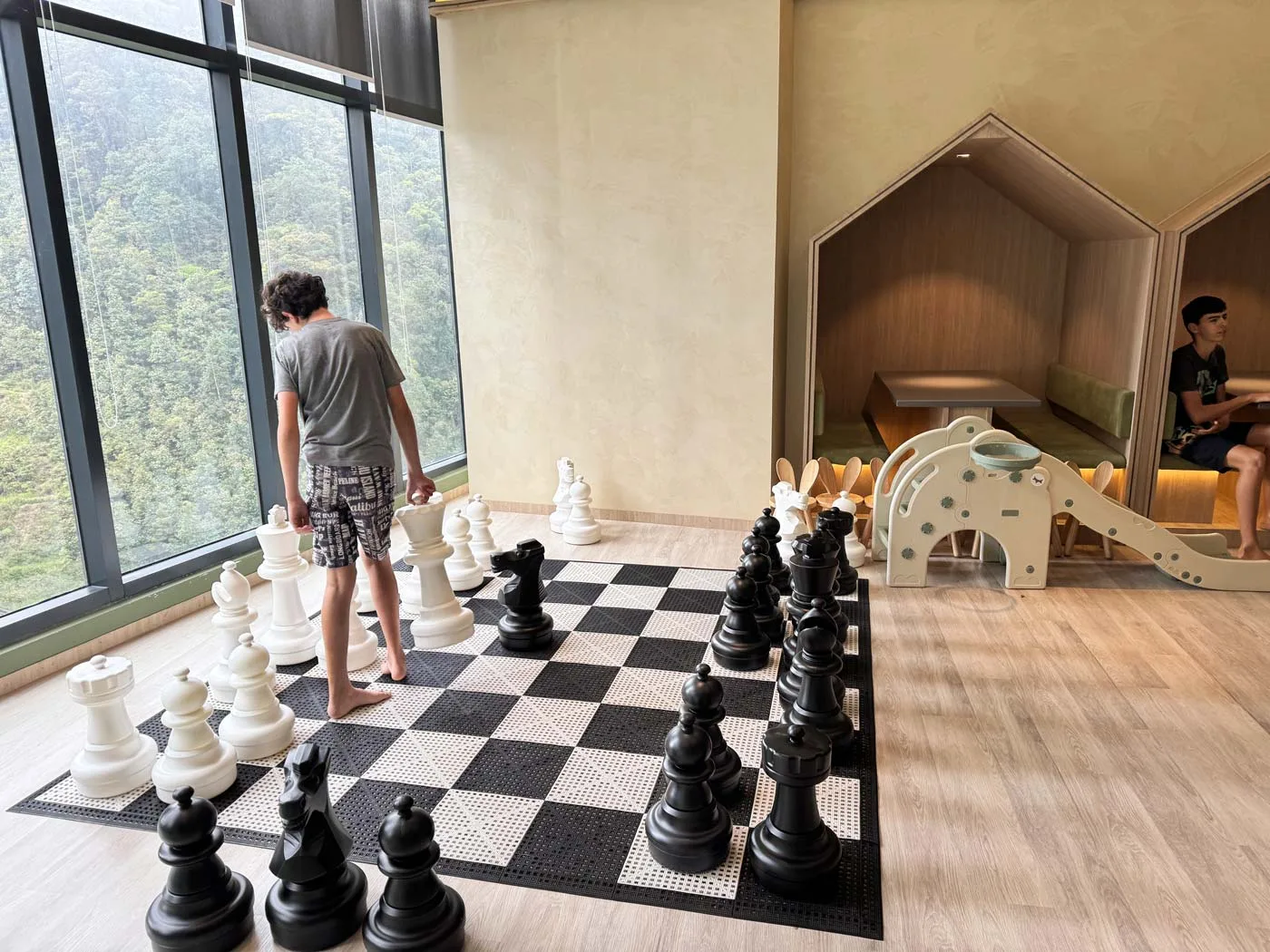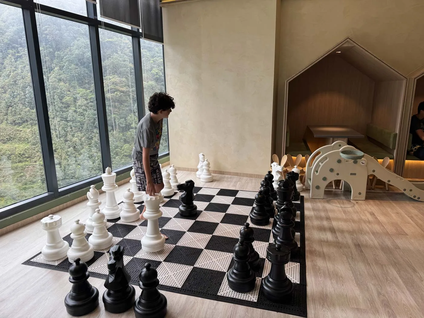 Kid-oriented spaces we saw: the indoor pool area with a kids’ pool, a games room with age-appropriate activities, and dedicated play areas. The games room seemed suitable for tweens and younger kids. Most of the climbing activities would be for younger kids, but we enjoyed the life-size chessboard.