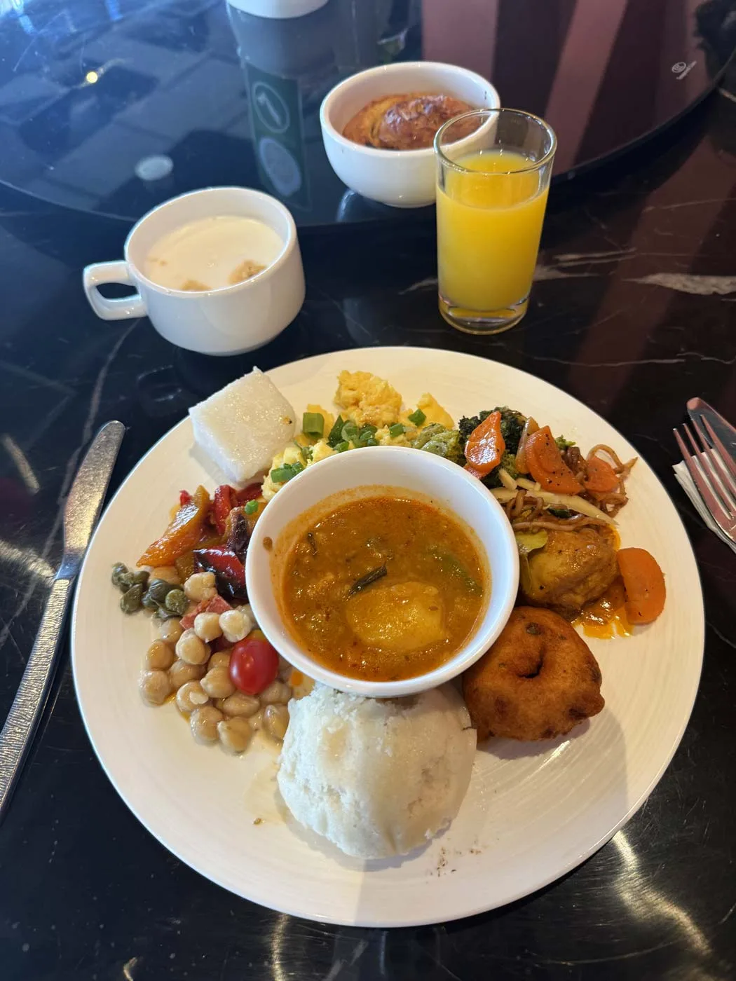 Specific items we saw and tried: fresh fruit (watermelon, papaya, pineapple), pastries and bread, good coffee, masala tea that our family loved, an omelette station where cooks prepared eggs to order, sausages, fried eggs, yogurt with various toppings, and fresh-squeezed juice. There were also local Malaysian dishes to try – rice, chicken, noodles, and all kinds of sauces and toppings.