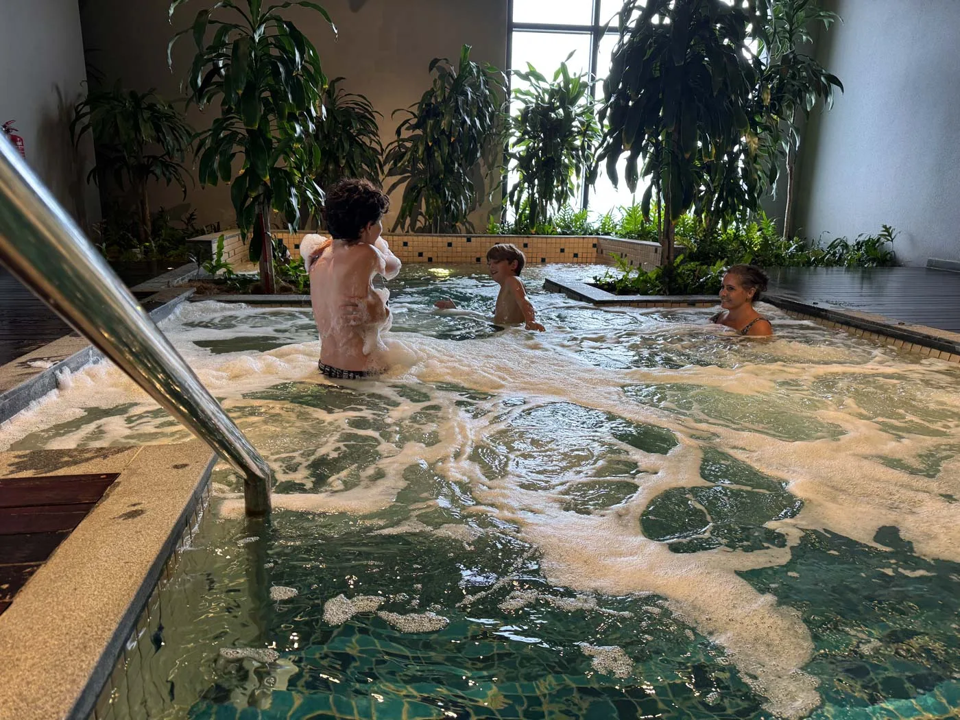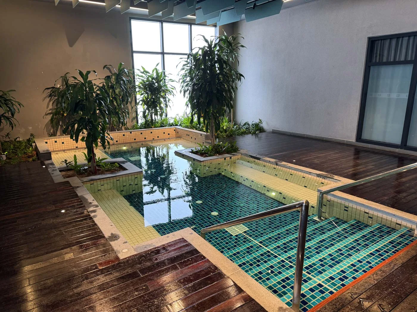 The jacuzzi area sits surrounded by greenery, creating a slightly more relaxed vibe than the main pool deck. It fits maybe 6-8 people comfortably. It felt family-friendly during the day. Our boys don’t care much for sitting still, so the pools were a better option.